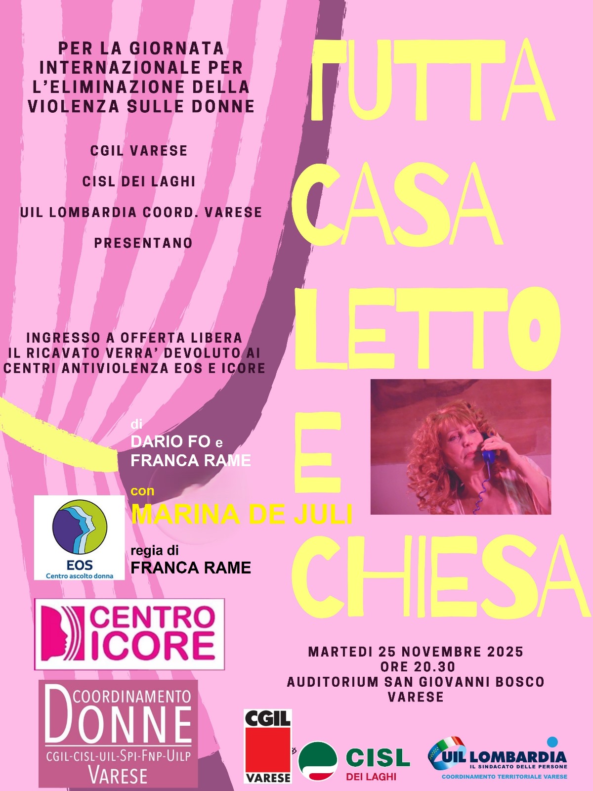 In occasione del 25 novembre, Giornata Internazionale per l’Eliminazione della Violenza sulle Donne, organizzeremo uno spettacolo teatrale intitolato “Tutta casa, letto e chiesa” di Franca Rame e Dario Fo, regia di Franca Rame con Marina De Juli, uno spettacolo tra il comico e il grottesco e allo stesso tempo geniale sulla condizione della donna, che si dipana fra un’ironia sapiente e uno slancio alla riflessione e all’impegno sociale. Tutto visto con gli occhi delle donne che non hanno perso la capacità di ridere guardandosi allo specchio. Una donna che è mille donne, in cui ci si può riconoscere e di cui è facile sentirsi sorelle. Marina De Juli passa da una recitazione alla Franca Rame con monologhi come “La donna sola” – una donna che ha tutto all’interno della propria casa, ma non il rispetto da parte del marito e narra in modo tragicomico la sua vita – e “Il risveglio” – un brano per raccontare la donna d’oggi risucchiata dallo stress della vita quotidiana – al linguaggio di Dario Fo con un’antica giullarata dal titolo “La parpaja topola”, per poi ritornare a chiacchierare con il pubblico parlando di sesso in un’esilarante e grottesca “lezione”, a dimostrazione che si può ridere di gusto, pur meditando sulle proprie macerie.